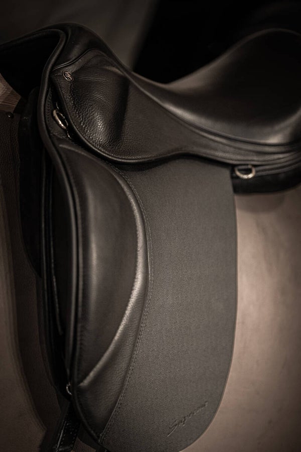 Die inneren Kniepauschen sind anatomisch abgewinkelt, um zusätzliche Freiheit im Sattel zu bieten. Der Reiter hat nicht das Gefühl, dass seine Beine zurückgedrückt werden, und die äußeren Pauschen über den Kniepolstern sind mit Latex gepolstert und mit demselben hochwertigen Kalbsleder wie der Sitz bezogen, wodurch ein Abrutschen der Beine von den Kniepauschen verhindert wird.