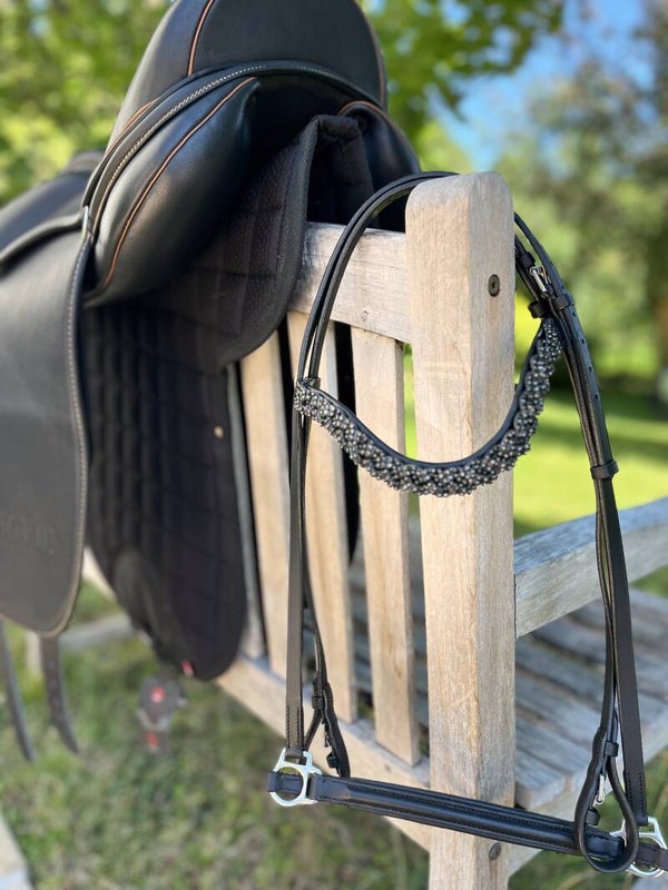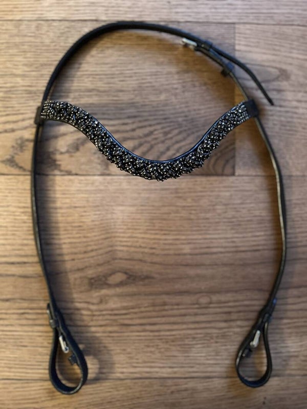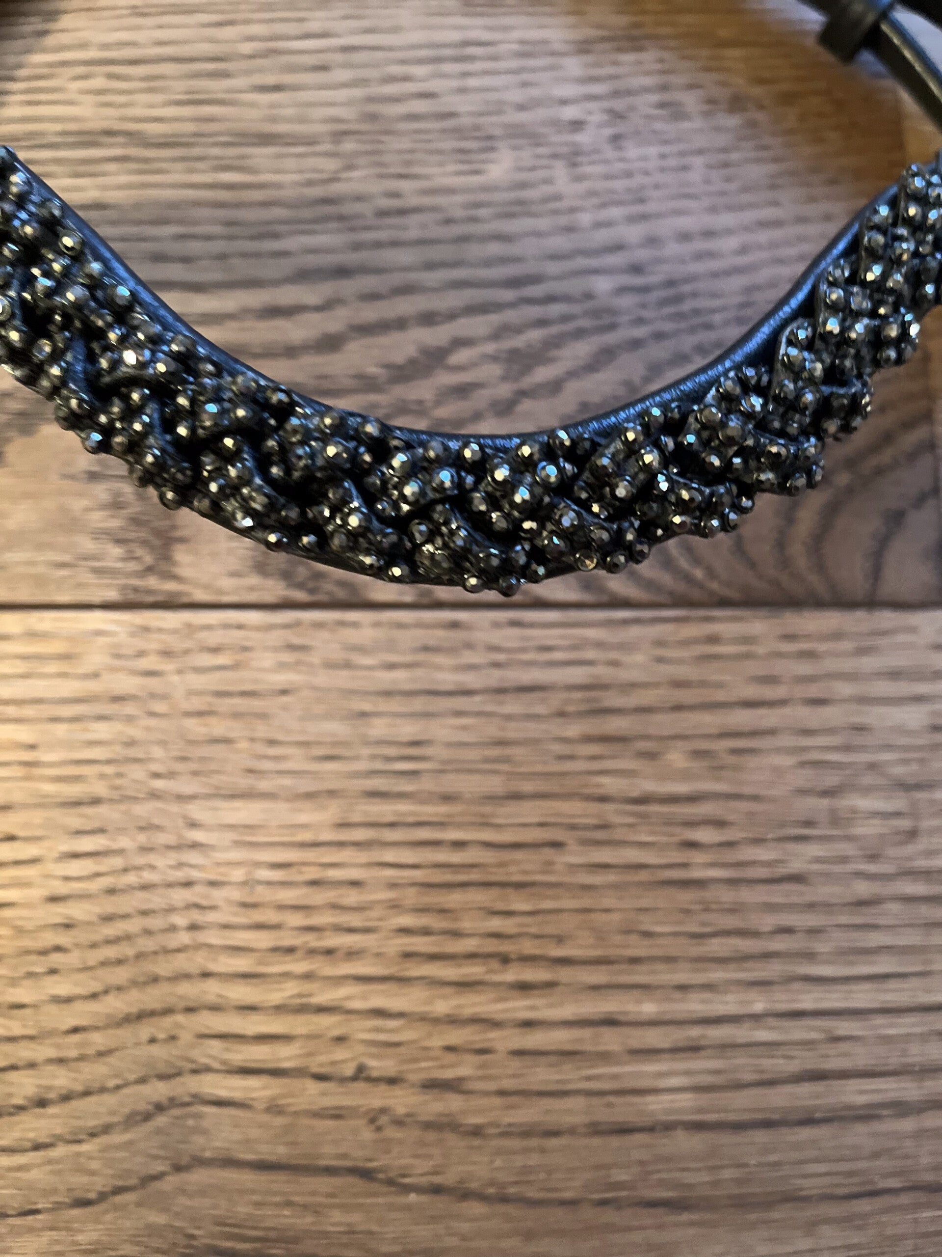 Kopfstück mit geschwungenem Stirnriemen mit schwarzer geflochtener Steinchenverzierung, kombinierbar mit hannoveranischem und/oder anatomischem Nasenriemen