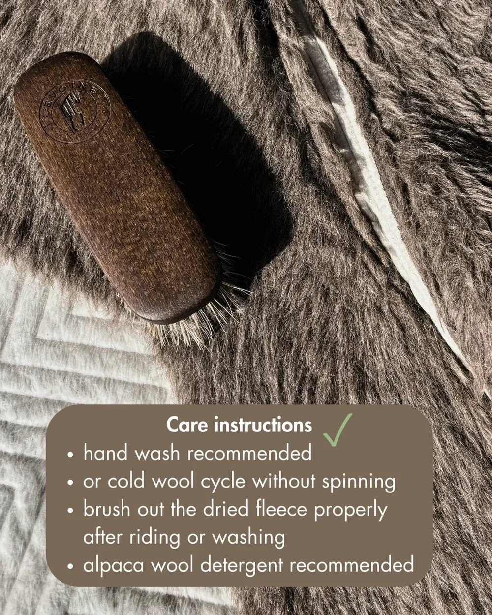 Alpakavlies Produkte können bei 20-30 Grad im Wollwaschgang gewaschen werden - Schleudergang ausstellen. Nach der Wäsche in Form ziehen und an der Luft trocknen lassen. Der trockene Alpakavlies kann mit einer Wurzelbürste von Pferdehaaren befreit werden. Alpakavlies ist von Natur aus anti-bakteriell und muss nicht zu häufig gewaschen werden.