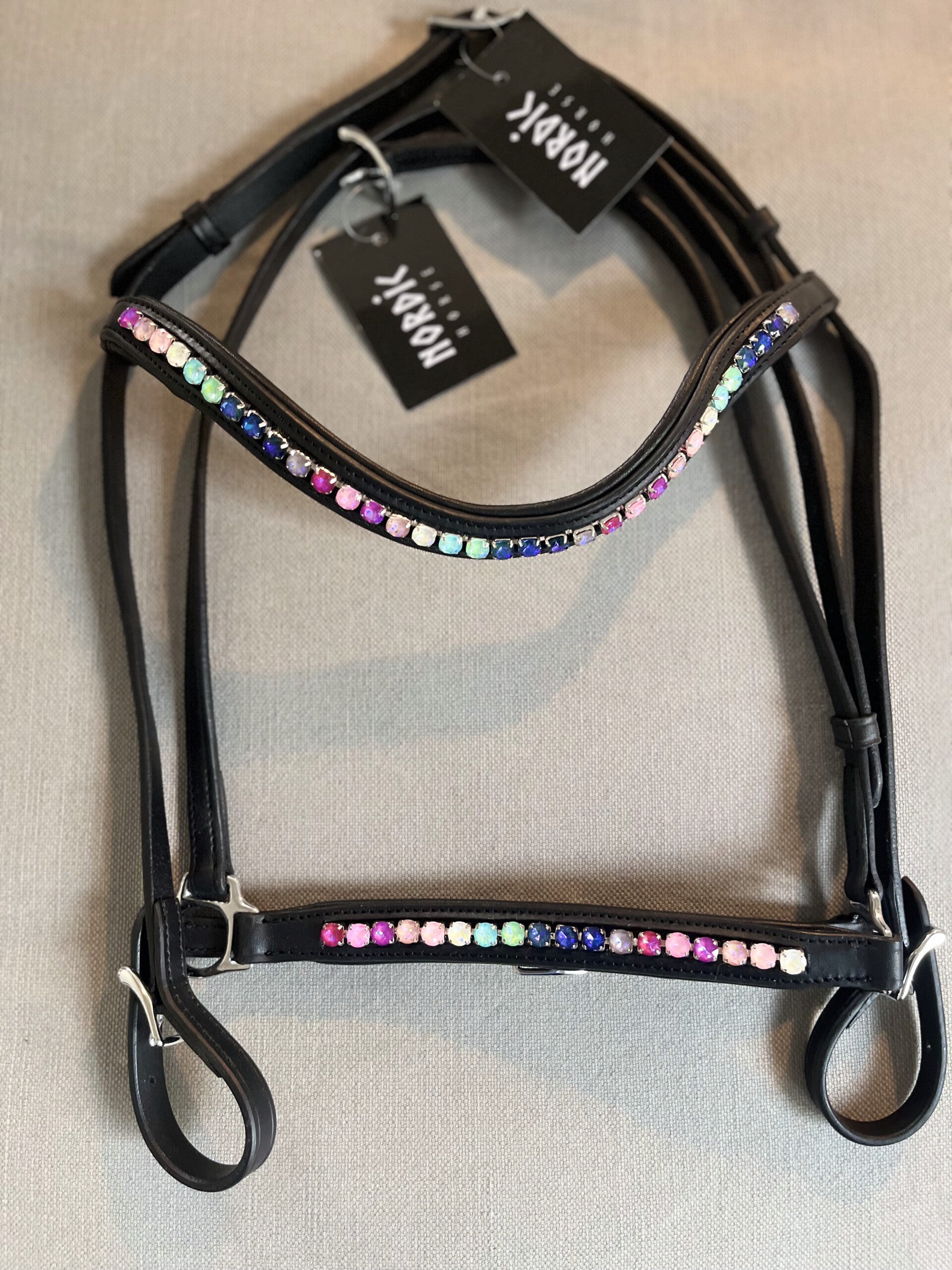 Kopfstück aus schwarzem, englischem Leder mit silbernen Schnallen. Wunderschönes geschwungenes Stirnband mit Steinen in den Farben des Regenbogens. Das Stirnband kann gewechselt werden.