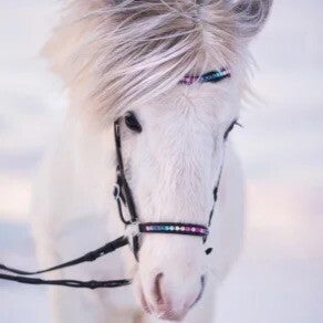 Hannoveranisches Reithalfter mit regenbogenfarbenen Steinen. Schwarzes Leder mit silbernen Schnallen.