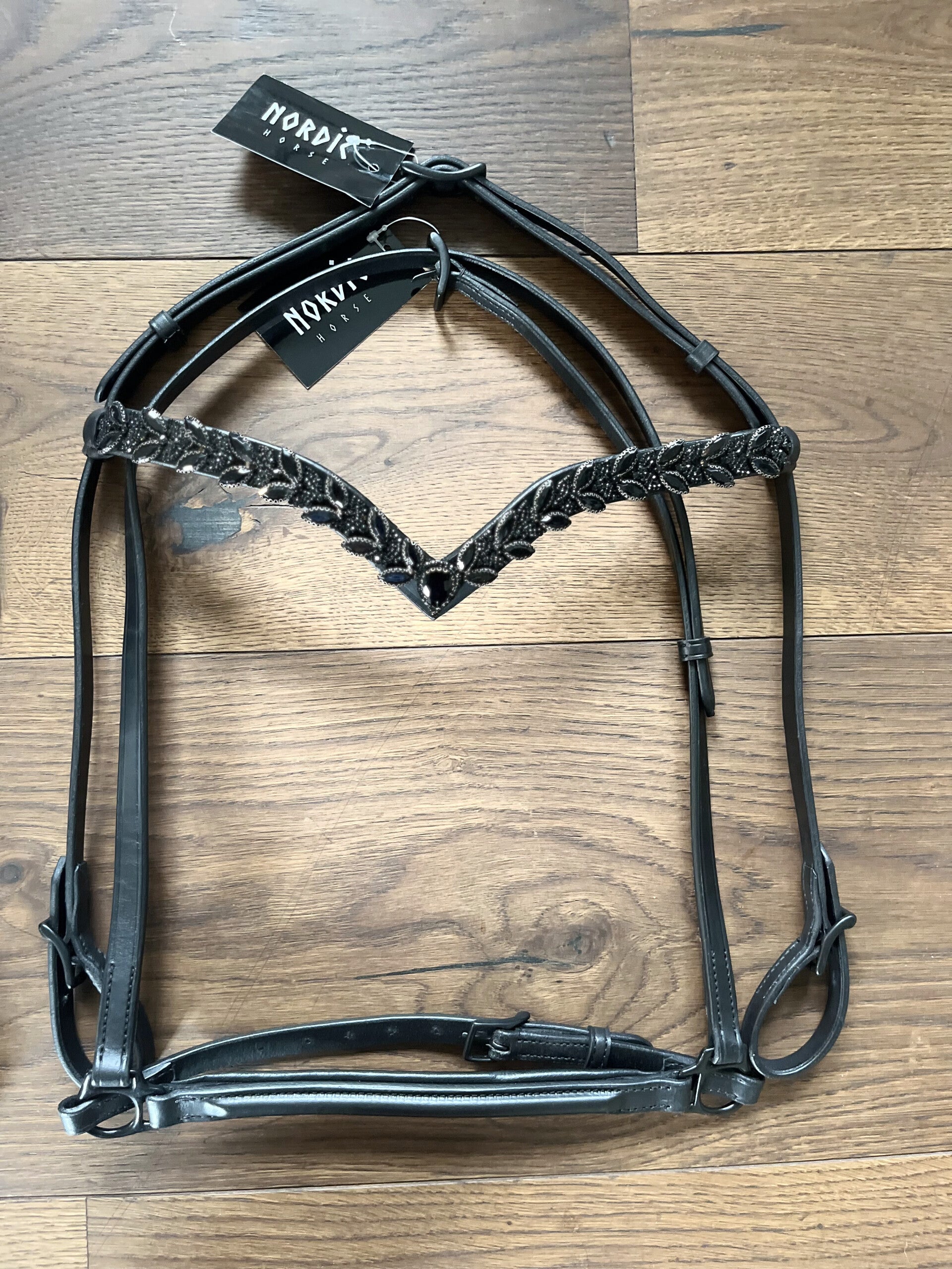 Wunderschönes Kopfstück aus schwarzem Leder mit breitem V-Stirnband mit schwarz glitzernden Blättern.
