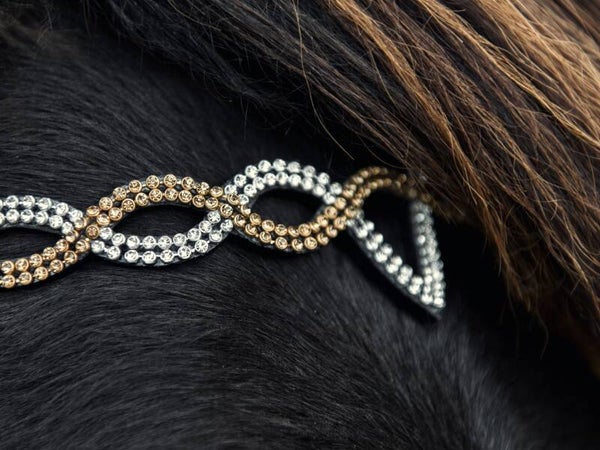 Kopfstück aus schwarzem Leder und Stirnriemen mit Spitze in der Mitte und mit Steinchen verziertem Muster
