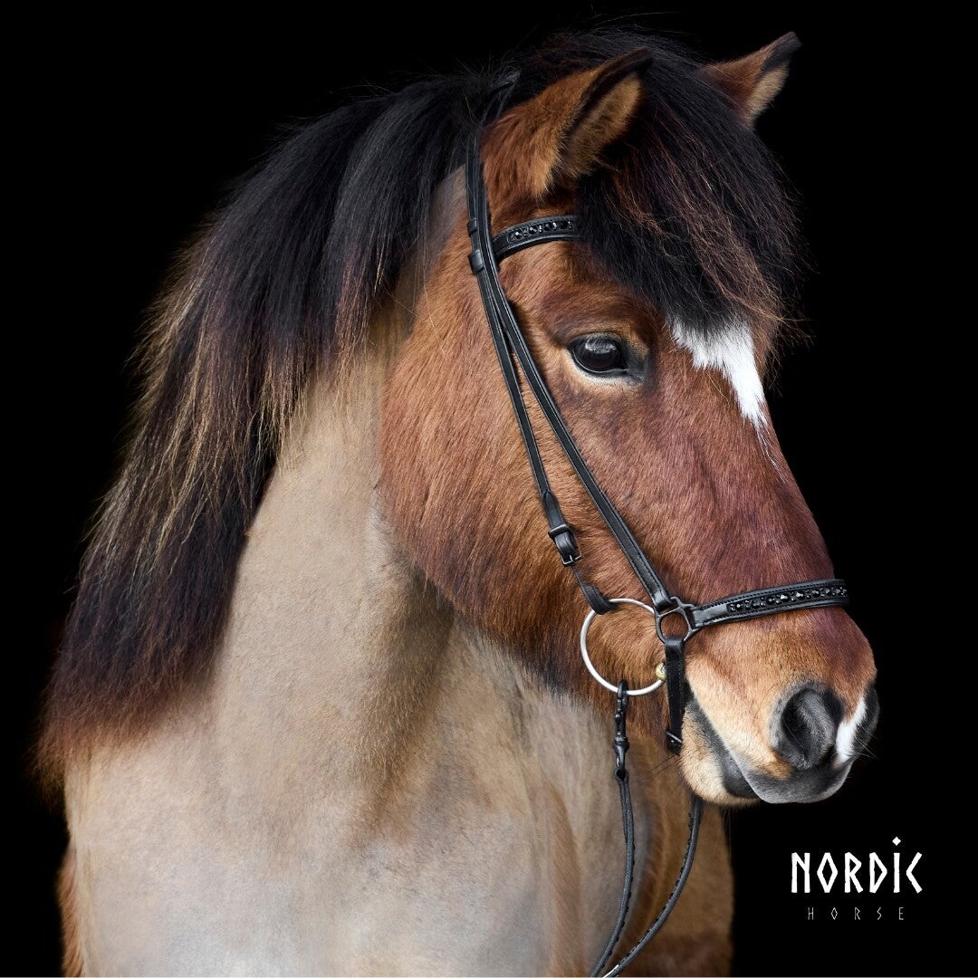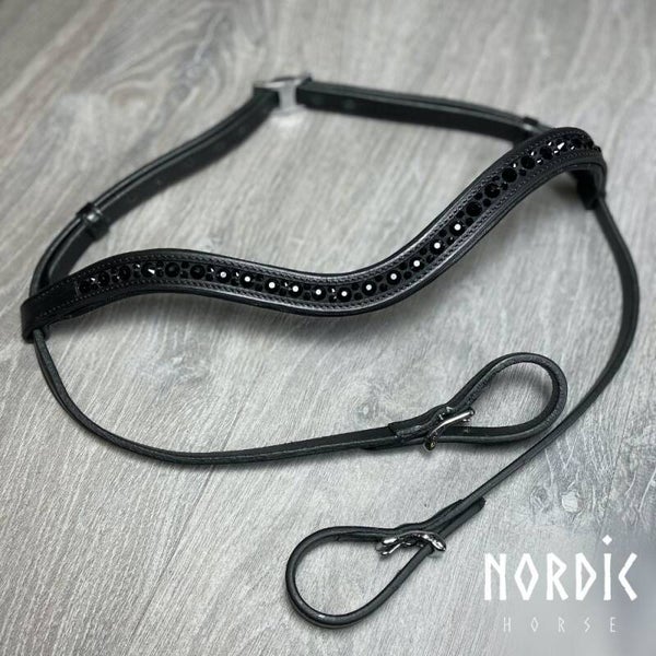 Kopfstück aus schwarzem Leder mit schwarzen Hotfix-Steinen im Muster. Stirnriemen können gewechselt werden.