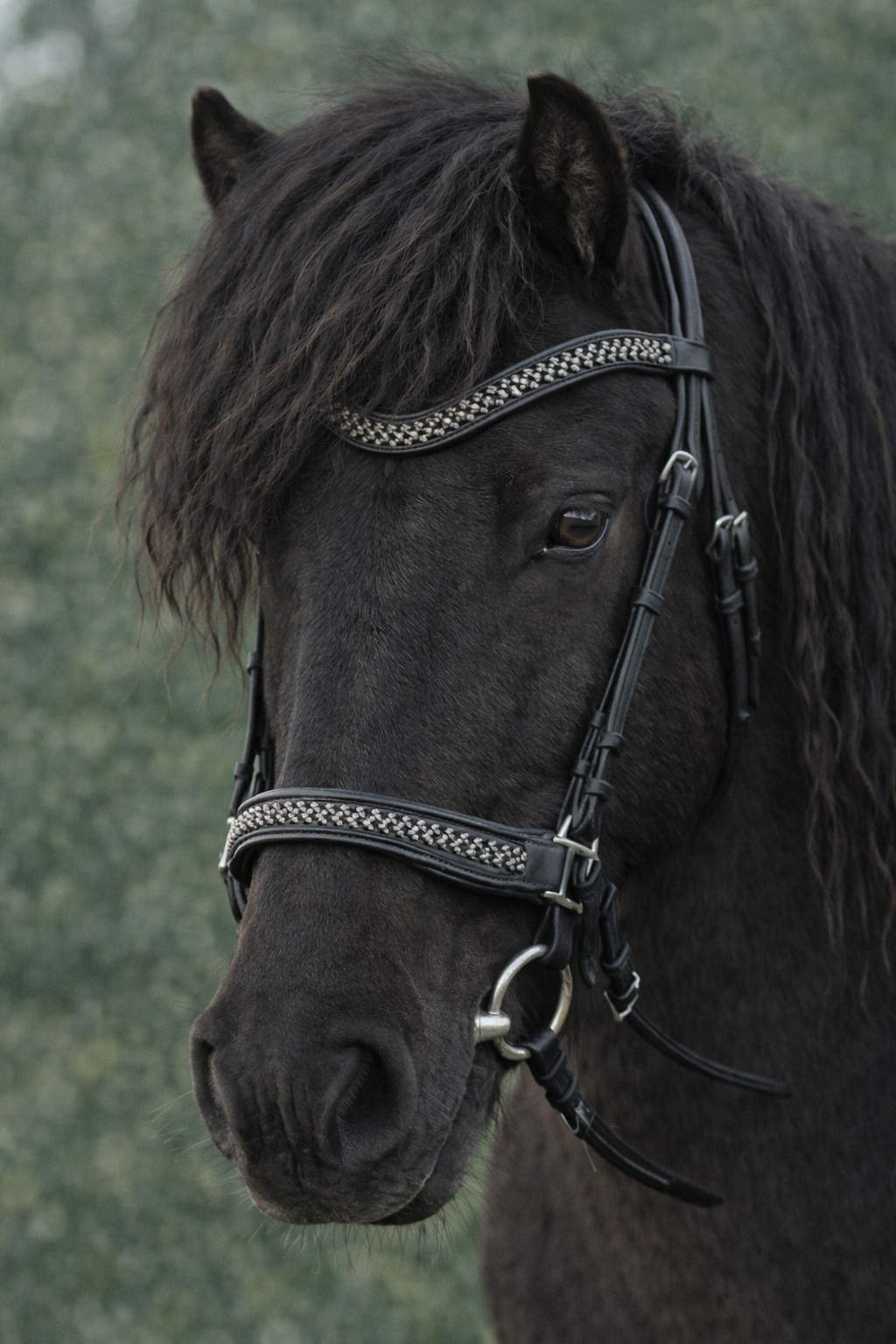 Sehr schöne komplette Trense aus schwarzem Leder mit silberner Flechtung auf Stirn- und Nasenriemen. Nasenriemen anatomisch