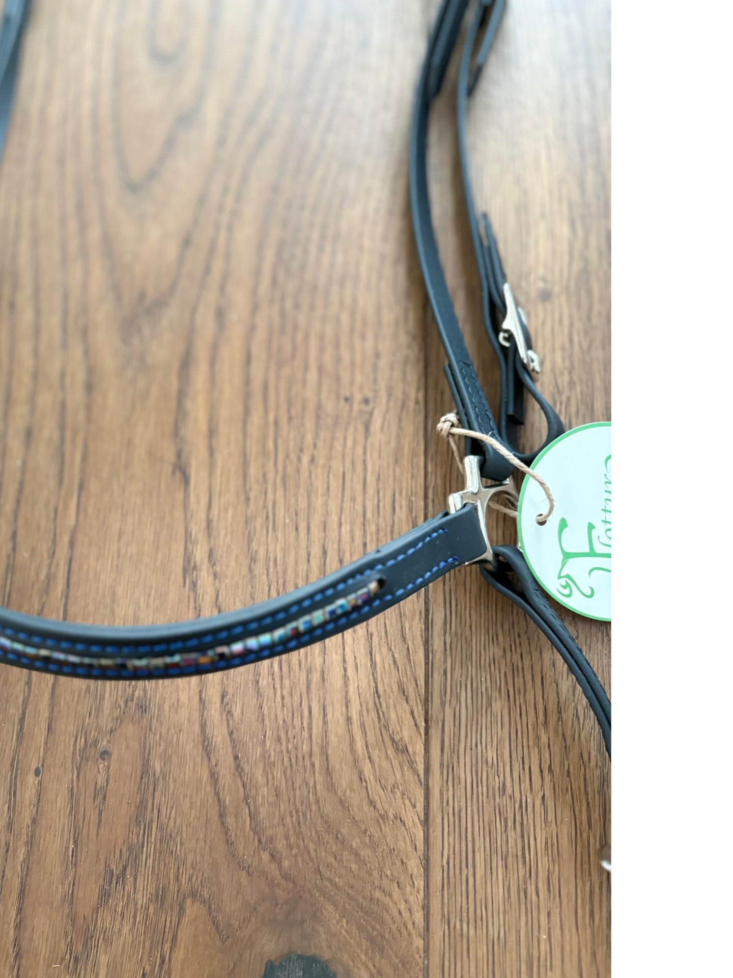 Hier der Nasenriemen in schwarz mit mehrfarbig schillernden "Árora- Perlen". Dazu der Genickriemen in schwarz.