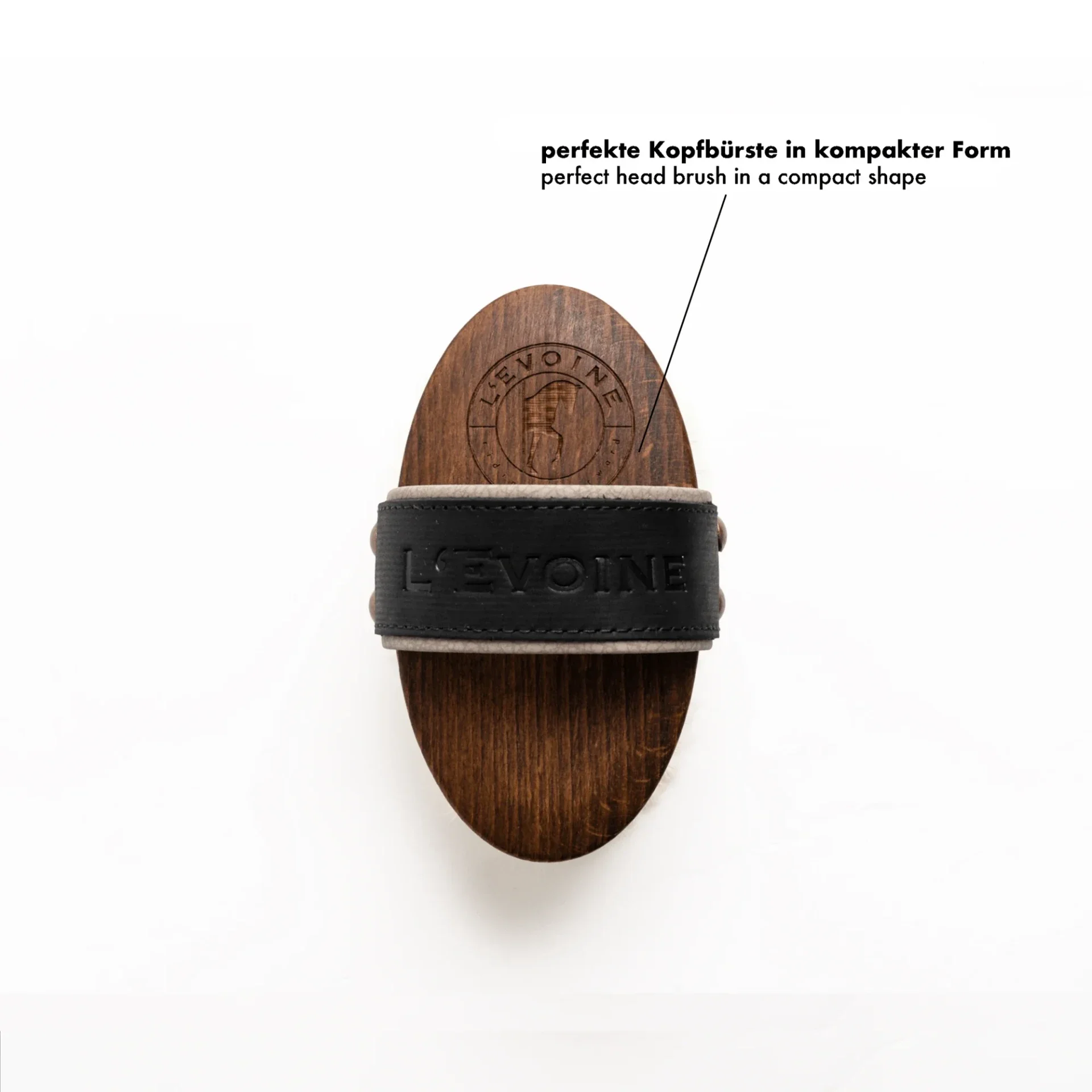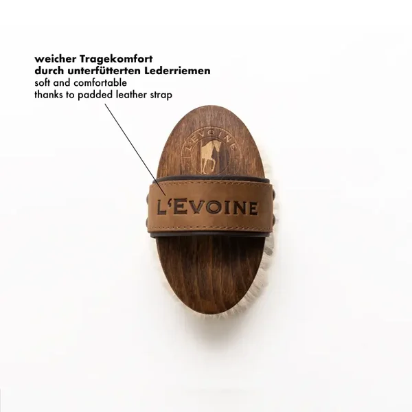 Holz ist von Natur aus antibakteriell und liegt auch bei kalten Temperaturen im Winter angenehm in der Hand. Die Lederriemen passen farblich perfekt zu der L'Evoine Putztaschen Kollektion.